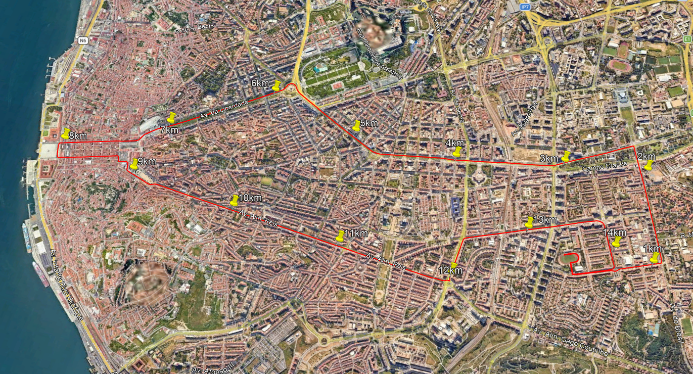 Percurso Corrida 15km | Partida no Estádio 1º de Maio – INATEL, seguirá depois pela Av. Rio de Janeiro, Av. do Brasil, Campo Grande, Entrecampos, Av. da República, Praça Duque de Saldanha, Av. Fontes Pereira de Melo, Marquês de Pombal, Av. da Liberdade, Pç. dos Restauradores, Rossio, R. do Ouro, à esquerda à entrada na Praça do Comércio, R. da Prata, Praça da Figueira, R. Dom Duarte, Martim Moniz, R. da Palma, Av. Almirante Reis, Praça do Areeiro, Av. João XXI, Av. de Roma, Pç. de Alvalade, Av. da Igreja, Av. Rio de Janeiro e Estádio 1º de Maio – INATEL.