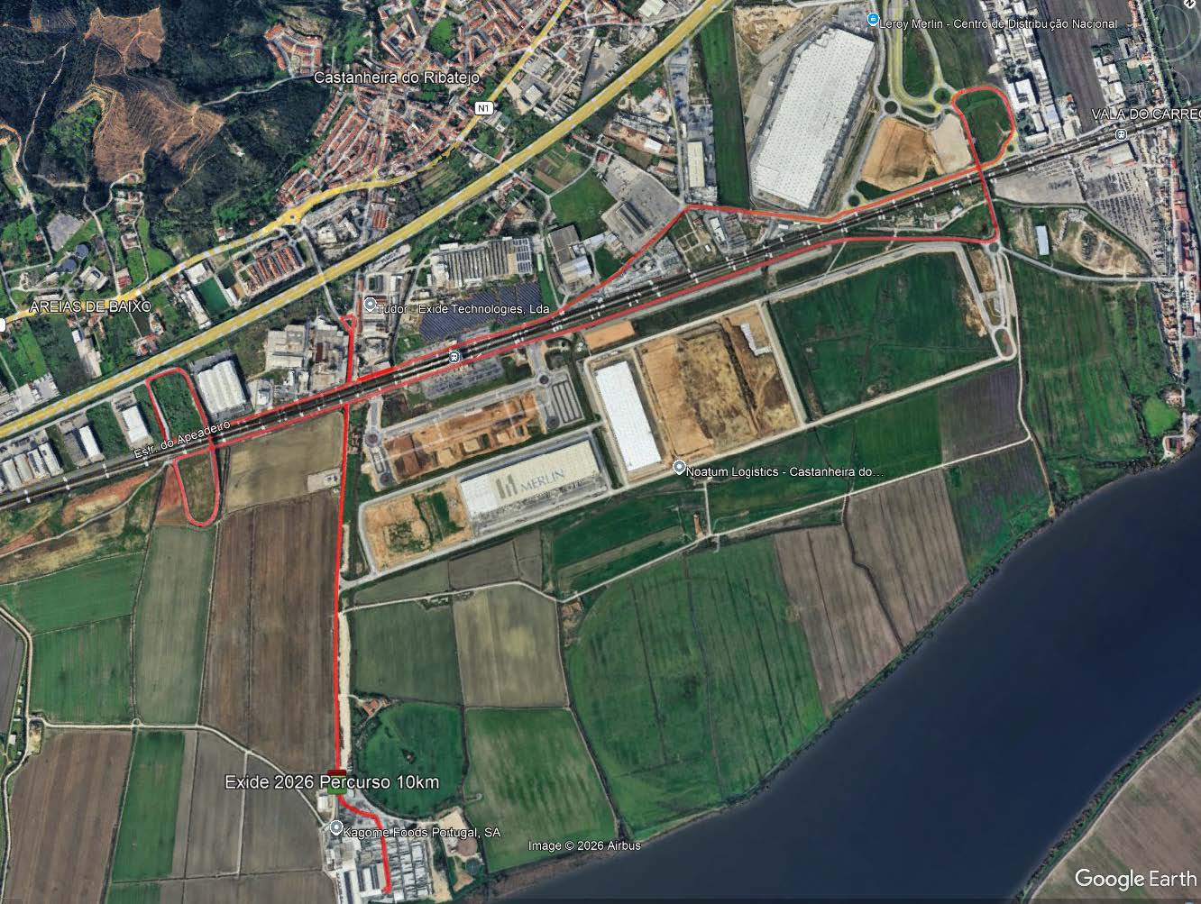 Percurso Corrida 10km | Partida na Fábrica Hit / Estrada da Lezíria do Cortes / Av. do Emáus / Estrada das Salgadinhas / Rua dos Laboratórios / Estrada do Porto da Areia / Estrada do Apeadeiro / Av. Dr. Carlos Leal / Estrada do Apeadeiro/ Qt.ª das Areias / Estrada do Polígono dos Álamos / Av. do Emáus / Estrada da Lezíria do Cortes / Meta na Fábrica Hit.